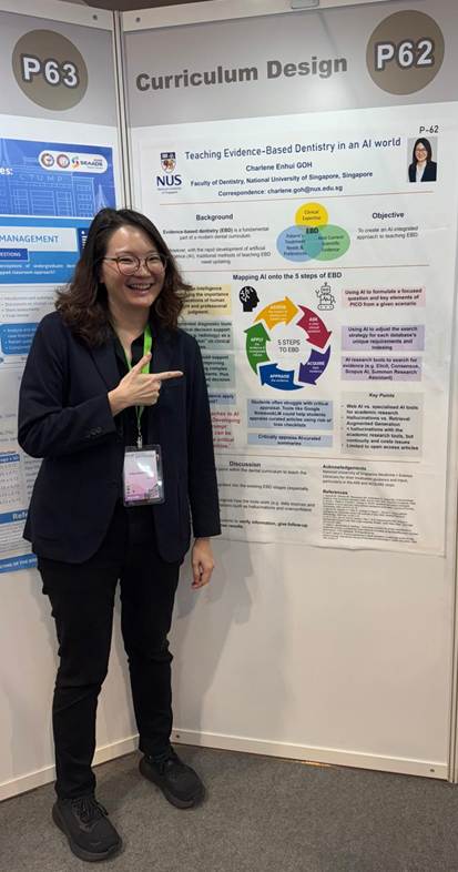 Assistant Professor Charlene Goh, Director of the Discipline of Primary Dental Care & Population Oral Health at NUS Dentistry, and Dr Lee also shared their experiences in dental education through a poster and oral presentation on “Teaching Evidence-Based Dentistry in an AI World” and “Exploring Dental Undergraduates Learning Experiences from a Special Care Dentistry Curriculum” respectively.  Their work contributed to a rich exchange of ideas among programme participants and audiences.